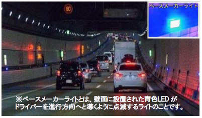 東京湾アクアラインについては、ETC車を対象とした料金割引(平成21年8月~)、大型商業施設の開業(平成24年4月~)により交通量が年々増加し、週末には恒常的に渋滞が発生しています。なかでも、木更津から川崎方面へと向かう上り線のアクアトンネルは上り坂になっていることから気づかないうちに速度が低下し、渋滞の発生につながっています。そのような箇所では壁面にペースメーカーライトを設置し、速度低下予防の対策を実施しています。