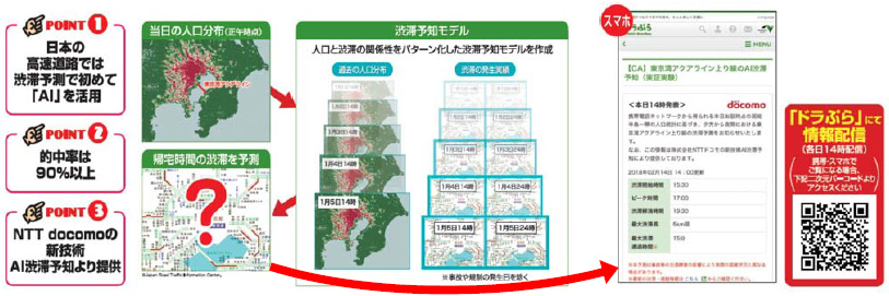 また、昨年の11 月よりNTTドコモのAI 技術を活用した、渋滞予測『AI渋滞予知』を実施しています。当日の人出をもとに予測するため、天候やイベントなどの影響を考慮した高精度な予測が可能となっております。アクアラインで房総半島にお出かけの際は是非ご活用ください。