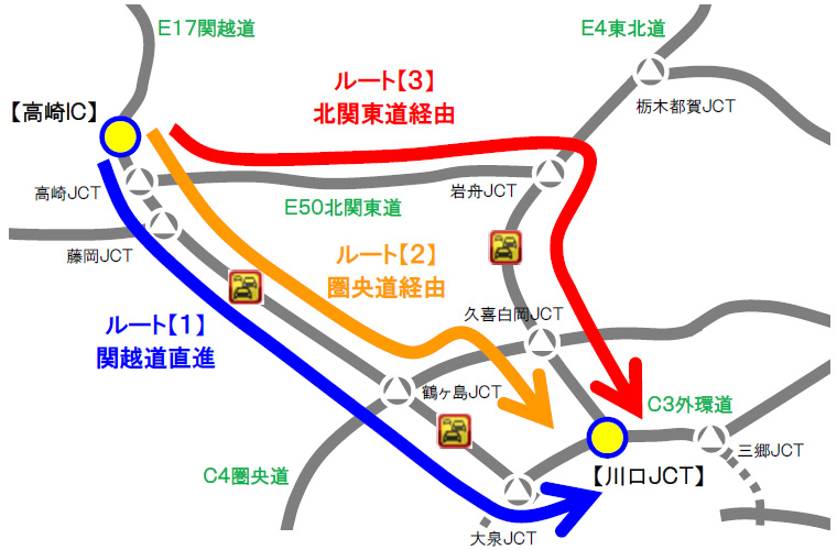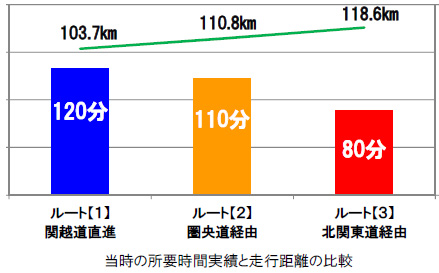 - その結果、関越道などで発生した渋滞により、走行距離の長い北関東道経由のルートの 所要時間の方が、40分程度短くなる時間帯がありました。