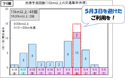 - 下り線の渋滞は午前中を中心に発生し、特に5月3日(金)は多発する見込みです。