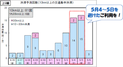 - 上り線の渋滞は夕方を中心に発生し、特に5月4日(土)~5日(日)は多発する見込みです。