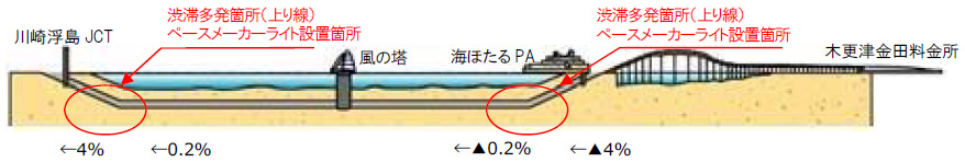 東京湾アクアラインの交通量は、ETC 車を対象とした料金割引(平成21年8月~)や大型商業施設の開業(平成24年4月~)等により年々増加し、週末には上下線で恒常的に渋滞が発生しています。多くの場合、アクアトンネル内の勾配変化に気づかず、速度低下してしまうことが渋滞発生の主要な原因となっています。