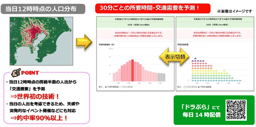 また、平成30年12月にNTT ドコモのAI 技術を活用した『AI 渋滞予知』をリニューアルし、30分毎のアクアライン通過に要する所要時間と交通需要の提供を開始しました。人口統計により把握した当日の人出をもとに、天候やイベントなどの影響を考慮した高精度な予測が可能となっております。アクアラインで房総半島にお出かけの際は是非ご活用ください。