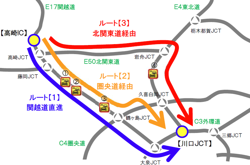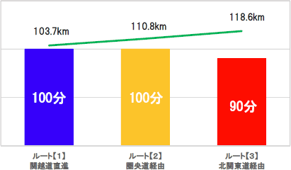 - その結果、関越道などで発生した渋滞により、走行距離の長い北関東道経由のルートの 所要時間の方が、10分程度短くなる時間帯がありました。