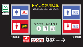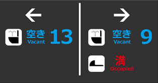 お客さまが迷わないよう、入り口部において、2棟あるトイレ棟の利用状況が分かる表示板を設置します。さらに女子トイレのホール部においては、トイレの利用状況をリアルタイムで表示します。