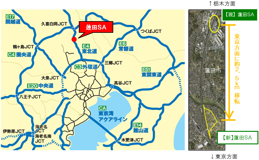 当SAは、埼玉県内のE4東北自動車道 岩槻インターチェンジ(以下「IC」)~久喜IC間にある現在の位置から東京方面に約2.5km移転します。
