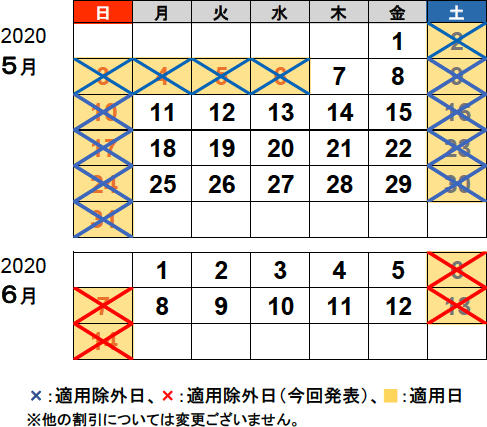 2020年6月14日までの土・日曜日について、休日割引を適用しないこととします。
