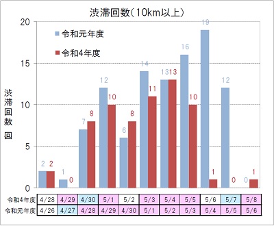 | 10km以上の渋滞 | 97回 | 169回 | 57% | 51回 | 190% | ||||