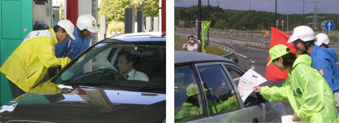 各実施場所において、高速道路をご利用の方へ直接、交通安全啓発チラシやグッズを手渡し、交通安全を呼びかけます。また、沿道では登り旗などを使った交通安全啓発を実施します。