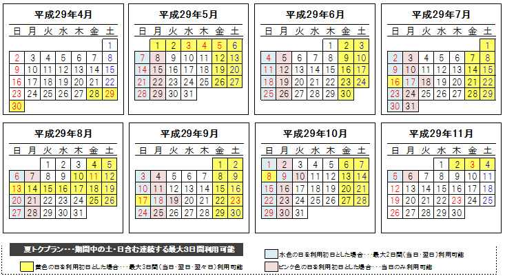 平成29年4月28日(金)~平成29年11月6日(月)までの下記カレンダーに定める期間のうち連続する最大3日間ご利用いただけます。