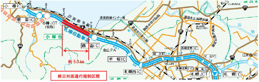 本工事の車線規制のほか、札樽自動車道では、銭函IC付近で函渠設置工事に伴う終日対面通行規制を実施中です。