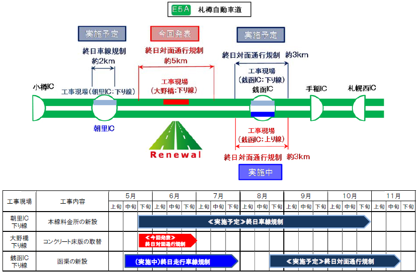 今回実施する工事は、E5A札樽自動車道 朝里インターチェンジ(IC)から銭函IC間に位置する大野橋(おおのばし)の下り線(札幌方面)において、老朽化した鉄筋コンクリート床版を新しい床版に取り替える工事を行うため、終日対面通行規制を実施させていただきます。