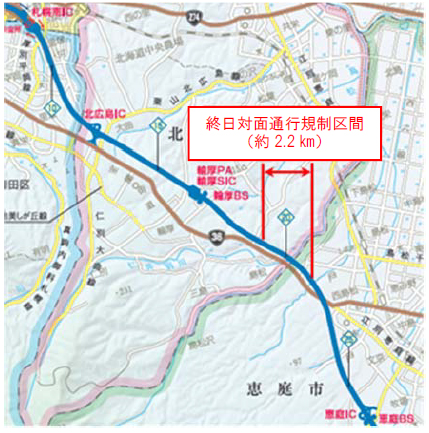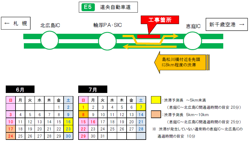 本工事による規制中には、工事箇所を先頭に下り線(札幌方向)で長い渋滞(主に土曜日は最大4km、日曜日は最大8km)が予測されておりますので、渋滞発生が予測される休日に当該区間のご利用を予定されているお客さまにおかれましては、ご利用ICの変更または公共交通機関のご利用をお願いいたします。