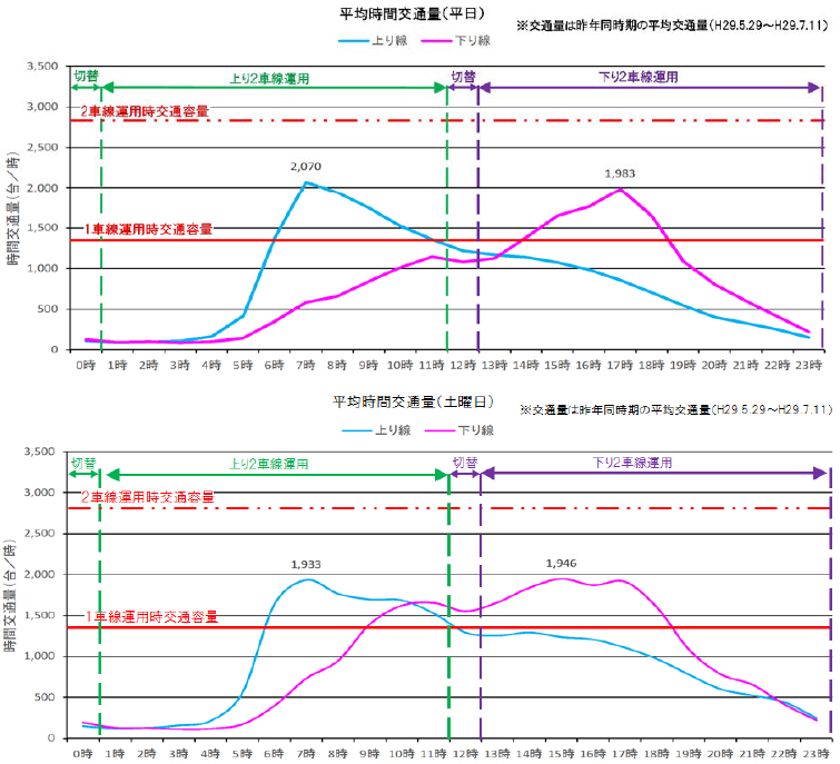 なお、切り替え時間帯においては、片側1車線ずつの車線運用となるため、混雑する場合がありますので、お出かけに際しましては、時間に余裕を持ってお出かけいただくなどご協力ください。