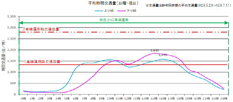 (1)平日及び土曜日の平均時間交通量午前に上り線(新千歳空港方面)、午後に下り線(札幌方面)の交通量が増加するため、1時~12時は上り線(新千歳空港方面)を2車線、13時~24時は下り線(札幌方面)を2車線にする運用とします。