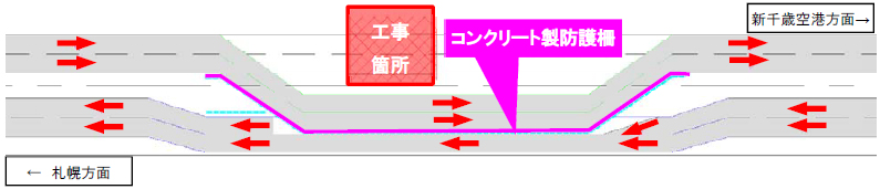 上り線(新千歳空港方面)、下り線(札幌方面)ともに朝・夕に交通量が増加するため、新千歳空港への定時性確保のため、終日上り線(新千歳空港方面)を2車線にする運用とします。