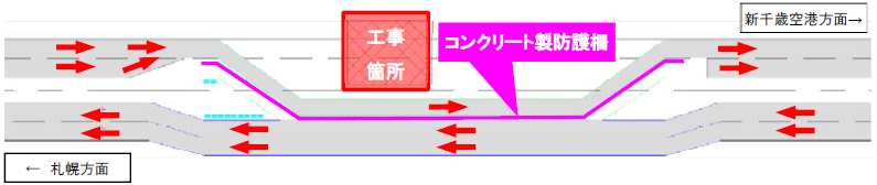 橋のコンクリート床版部分を取り替えるためには、上り線(新千歳空港方面)の通行止めを行う必要がありますが、上り線(新千歳空港方面)の車線を下り線(札幌方面)の通行に振り替え、3車線切り替え運用の対面通行とすることで交通への影響を最小限に抑えて、工事を実施します。