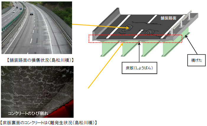 劣化した既設のコンクリート床版を、新しい床版に取り替えることにより、安全・快適にご利用いただける高速道路に生まれ変わります。