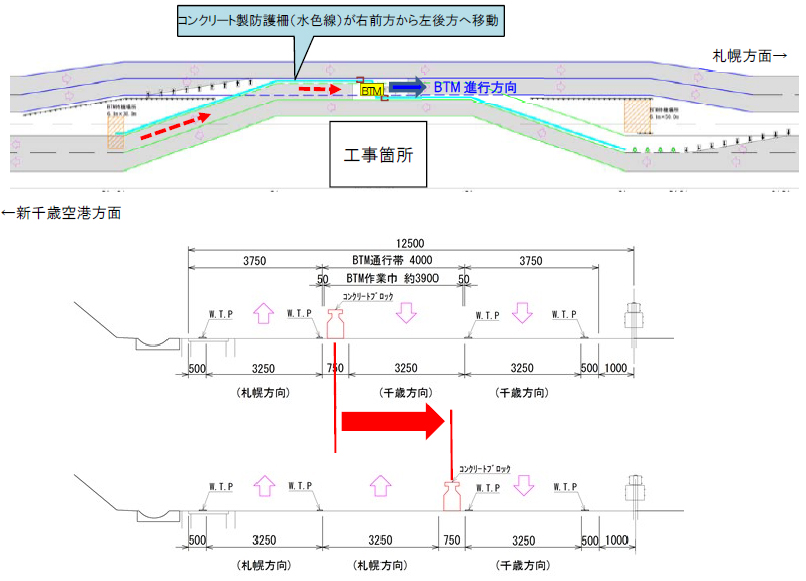 - コンクリート製防護柵の設置位置を、専用の防護柵切替用車両(BTM:Barrier TransferMachine)を用いて移動させることができるシステム