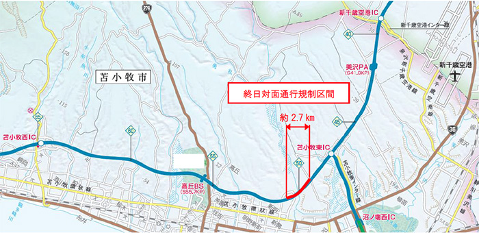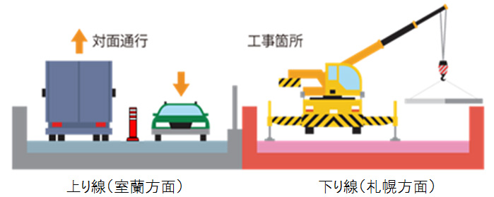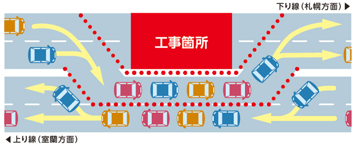 床版取替工事にあたり、上下線各2車線の区間を1車線に減少させ上り線(室蘭方面)に集約し、終日対面通行規制を実施します。