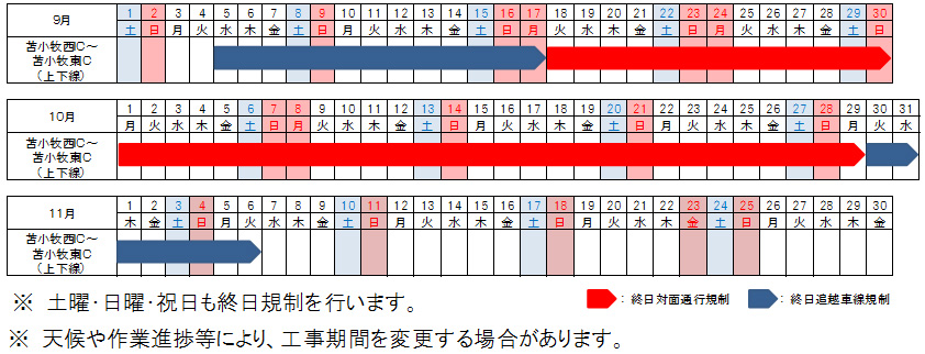 工事期間の開始から13日間と終了前の8日間は、対面通行規制へ車線を切り替えるための準備作業のため、上下線の終日追越車線規制となります。