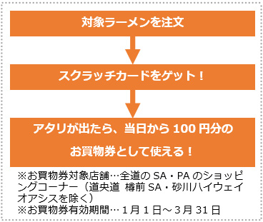 さらに北の大地のパワーを体に取り込んでいただけるよう、「主たる食材が北海道産であること」を条件にメニューをそろえました。加えて、書初めならぬ「ラーメン初め」にふさわしいよう、SA・PAで使えるお買物券が当たるスクラッチカードをプレゼントします。