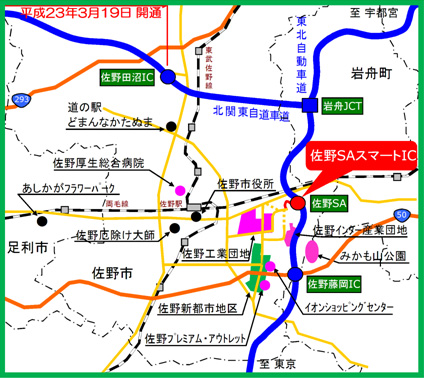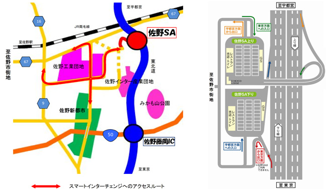 - 東北道(東京方面)から佐野SA下りをご利用いただいた後は、佐野SA下りのスマートIC出口はご利用できません。