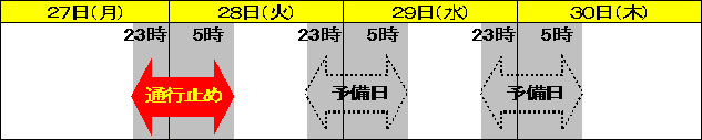 - 荒天の場合、夜間通行止めの実施判断は、実施当日の16時に行います。