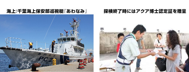 • 1:海上からのアクアライン探検は、当日の天候や波浪の状況により、急遽中止する場合があります。また、海難事故などにより、「あわなみ」へ千葉海上保安部から緊急出動要請が命じられた場合にも、予告なしに中止することがありますので、予めご了承ください。