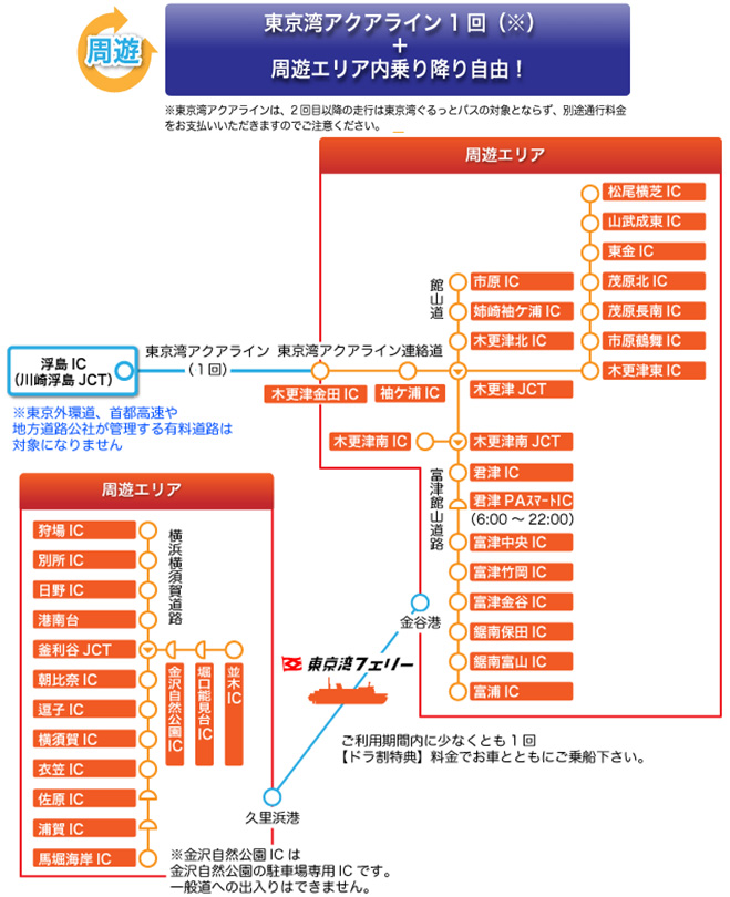 | 適用区間 | (1)乗り降り自由となる区間(周遊エリア) 館山道 市原IC~富津館山道路 富浦IC、圏央道 松尾横芝IC~東京湾アクアライン連絡道、木更津金田IC、横浜横須賀道路全区間 (2)1回の走行に限り適用となる区間 東京湾アクアライン ※後のページに区間の図を載せています。 |