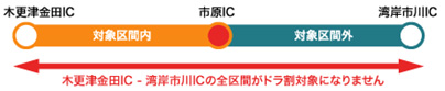- 対象区間を超えたご利用(市原ICから千葉市方面へなど)はドラ割の対象とならず、別途その走行全区間分の通行料金をお支払いいただくこととなりますのでご注意ください。