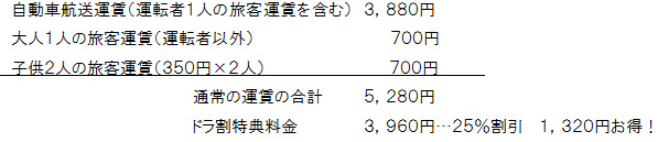 さらに、東京湾フェリーの料金が通常の料金(※2)5,280円のところ【ドラ割特典】25%割引で3,960円→1,320円お得!