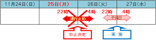 本日22時から翌朝4時に予定していました、新空港自動車道(新空港道)成田インターチェンジ(IC)~新空港IC間(下り線)夜間通行止めは、荒天により11月26日(火)の同時刻に順延いたしました。