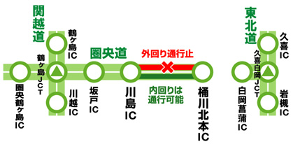 首都圏中央連絡自動車道 川島IC~桶川北本IC間(外回り)50時間連続通行止めのお知らせ