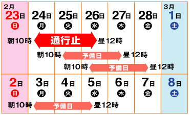 (2)通行止め日時:平成26年2月24日(月)10時 から 26日(水)12時まで 50時間連続