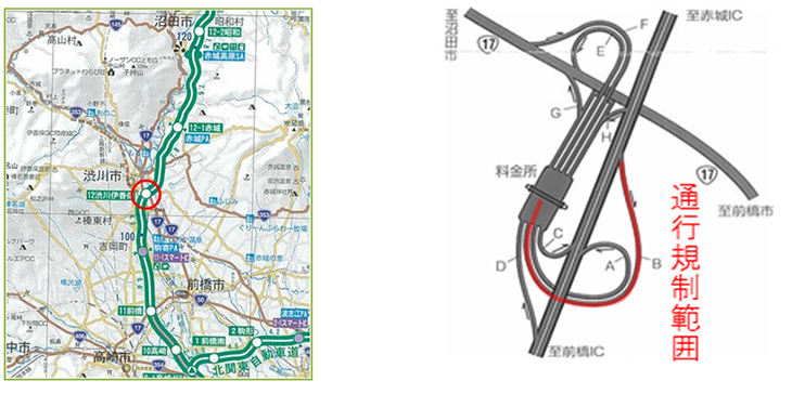 この工事に伴い、大型車のうち長さ12m以上、又は、幅2.5m以上の車両は、渋川伊香保IC(上り線)出口をご利用いただくことができません。通行規制中、この大型車のお客さまは手前IC(月夜野ICなど)へ迂回いただきますようお願いします。