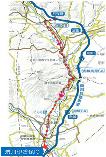 赤城IC・昭和IC・沼田ICを経由した迂回については、道路が狭小なため、月夜野ICからの迂回をお勧め致します。高速道路を利用し、月夜野ICから渋川伊香保ICを利用した場合、通常20分かかりますが、迂回路を利用した場合40分かかりますので、お時間にはゆとりをもってお出かけいただくよう、ご理解とご協力をお願い致します。