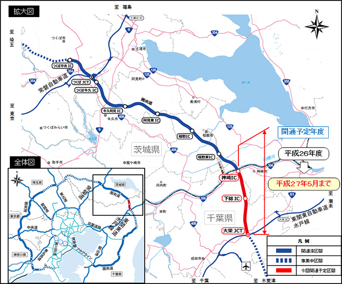 国土交通省関東地方整備局と東日本高速道路株式会社が共同で事業を進めている国道468号首都圏中央連絡自動車道(圏央道)の神崎ICから大栄JCT間については、平成26年度末の完成に向けて、地元の協力を得て休祭日の施工や施工時間の延長を行いつつ、工事を実施して参りました。