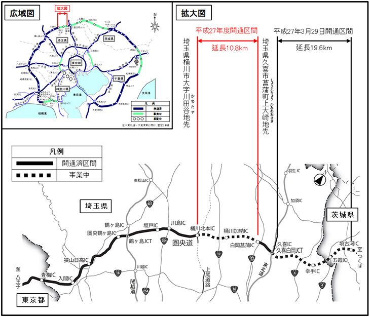 国土交通省関東地方整備局と東日本高速道路株式会社が共同で事業を進めている国道468号首都圏中央連絡自動車道(圏央道)の桶川北本IC~白岡菖蒲IC間については、平成27年度の開通を目指して整備を進めているところです。