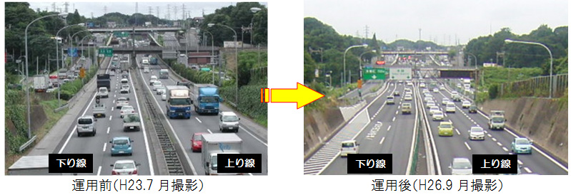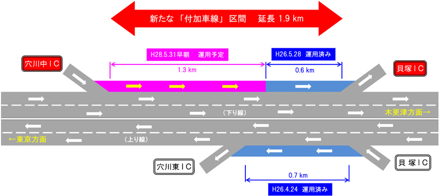 平成26年4月24日に上り線の穴川(東)IC~貝塚IC間を、同年5月28日に下り線の一部区間について付加車線の運用を先行開始しており、渋滞緩和や交通事故の削減について効果が得られております。