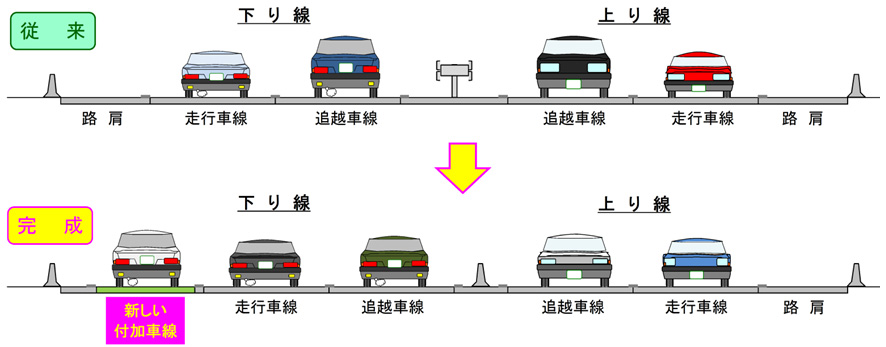 今回の付加車線の増設工事では、用地買収は行わず、路肩及び中央分離帯の幅を縮小のうえ、現況の道路用地を拡幅するなどして付加車線の必要断面を確保しました。
