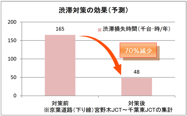 このため、交通の流れがスムーズになり、渋滞の緩和や交通の定時性・安全性が向上し、渋滞による損失時間が約70%程度減少すると見込んでおります。