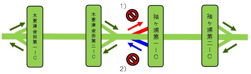 1)東京湾アクアライン連絡道(千葉・館山方面)から袖ヶ浦第一ICへは降りれません。
