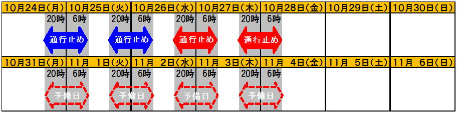 各日夜20時から翌朝6時まで(1日あたり10時間の夜間一部閉鎖)の計4夜間予備日:平成28年10月31日(月)・11月1日(火)・2日(水)・3日(木)