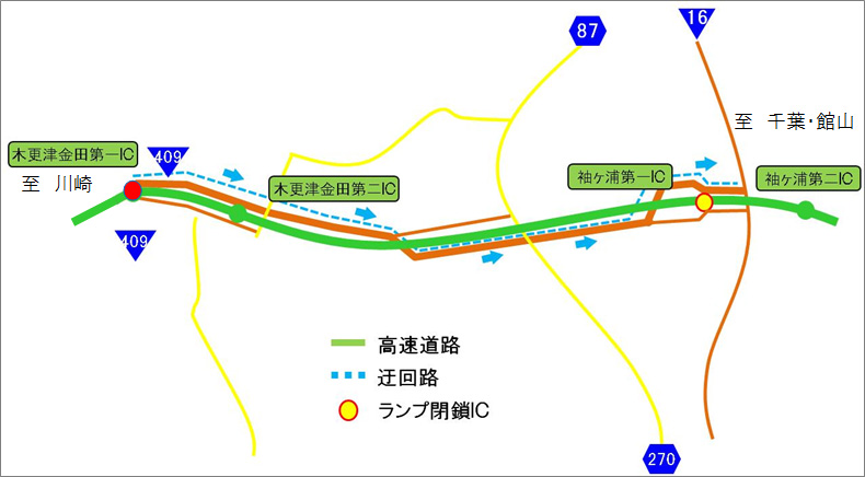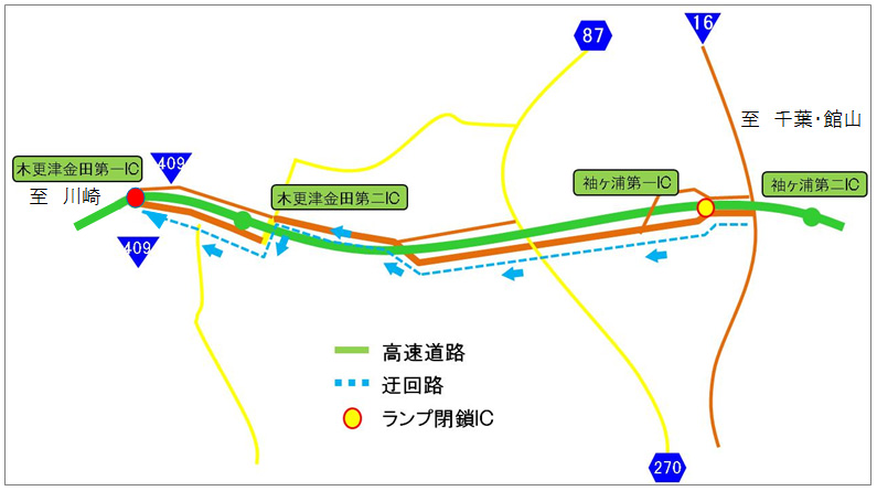 2)袖ヶ浦第一ICから東京湾アクアライン連絡道(川崎方面)へは乗れません。
