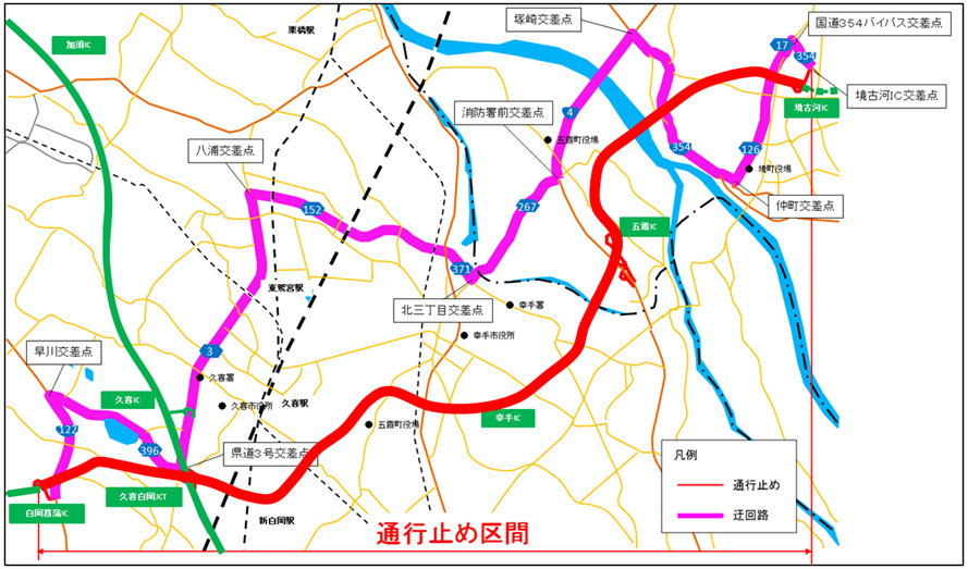 主に国道122号、県道396号、県道3号、県道152号、県道371号、県道267号、国道4号、国道354号、県道126号、県道17号、国道354号、を迂回路としてご利用ください。別紙-1【PDF:310KB】