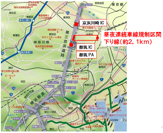 第三京浜道路 京浜川崎IC~都筑IC間 下り線の内、延長2.1km