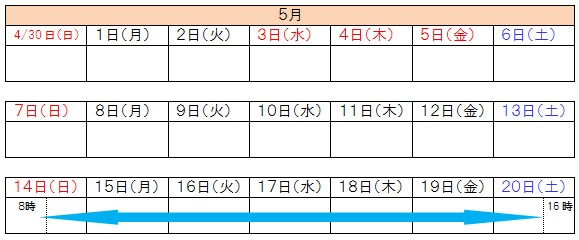 平成29年4月2日(日)8時から4月15日(土)16時までの土・日の一部を除く2週間