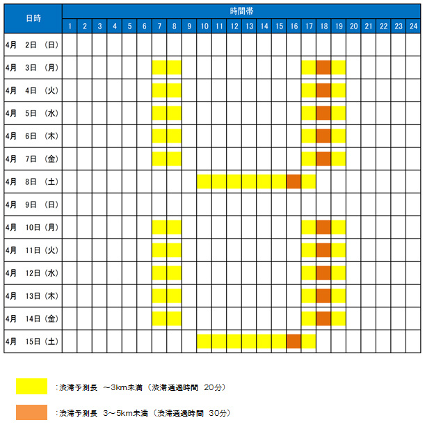 工事期間中は、平日及び土曜日に渋滞の発生を予測しています。特に平日(ピーク時間帯18時~19時)及び土曜日(ピーク時間帯16時~17時)は最大3kmの渋滞が予測されますので、時間にゆとりをもってお出かけ下さい
