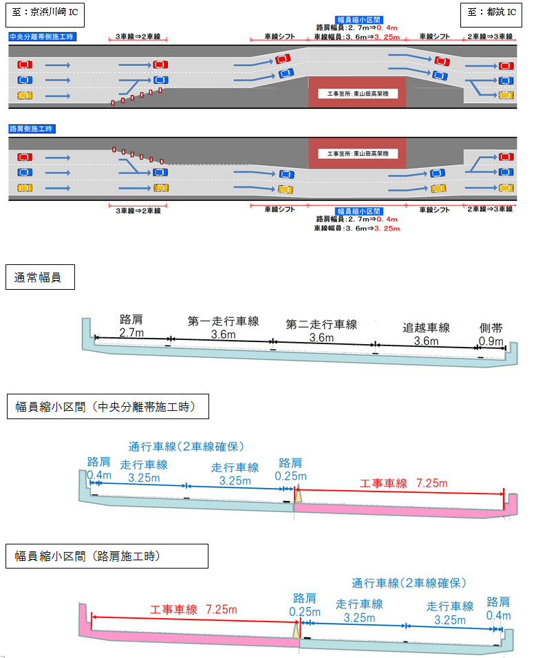 工事期間中は高速道路の混雑・渋滞、特に平日及び土曜日の夕方に最大3kmの渋滞が発生することが予想されます。